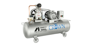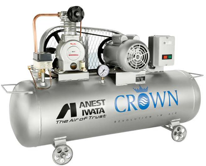 - The CROWN Series Air-Cooled Lubricated Reciprocating Air Compressor by Anest Iwata Motherson is engineered for reliability and performance. It features low noise, low vibration, enhanced air output, and minimal oil consumption. Designed for easy maintenance, it comes in compact models with varying tank sizes (40–160 liters) and is ideal for small to medium industrial applications requiring consistent compressed air under 10 kg/cm² pressure.